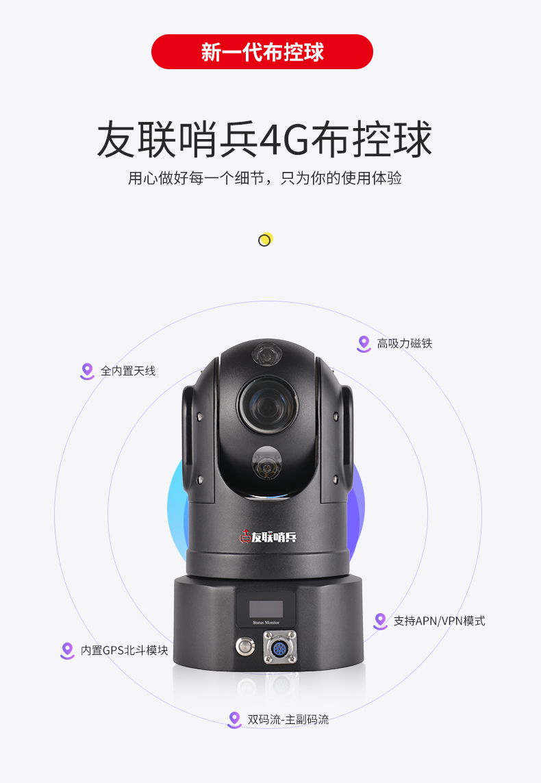 友聯哨兵4G高清布控球是一款功能全面、攜帶方便的無線視頻4G應急布控球產品,超高設備集成度,內置高性能鋰電池組,具備防水防震的特性,可滿足臨時布控和快速安裝的特殊要求。